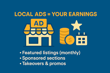 Sell ad placements and featured listings to local businesses. You keep the lion’s share.